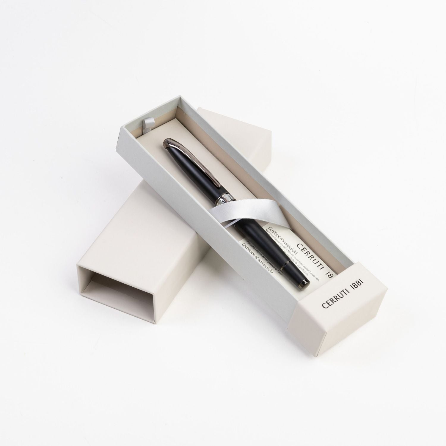 Der Stift "Abbey" basiert auf einer der ikonischsten Silhouetten der Cerruti-Schreiblinie. Jetzt wird er in diesem dezenten schwarzen Lack mit einer Mischung aus Chrom und Pistolenverzierungen neu erfunden. Bald ikonisch geworden.
