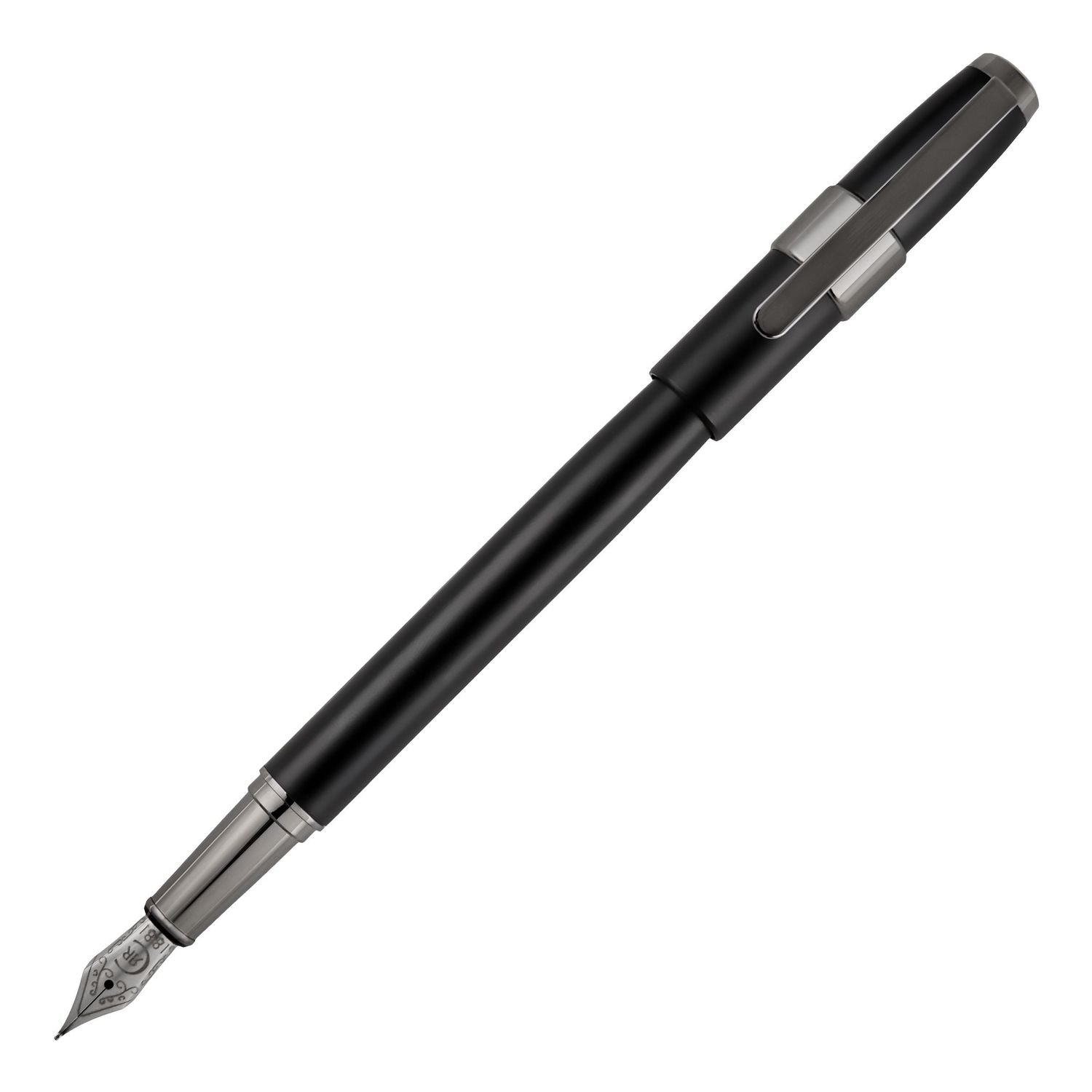 Die Block Kugelschreiber sind minimalistisch, einfach und luxuriös mit ihrem 3D-Logo-Ring auf der Kappe. Die Mattlack-Versionen haben ein minimales und modernes Gefühl. Dieser Füllfederhalter ist eine Mischung aus schwarzem Mattlack und Gun-Akzenten.