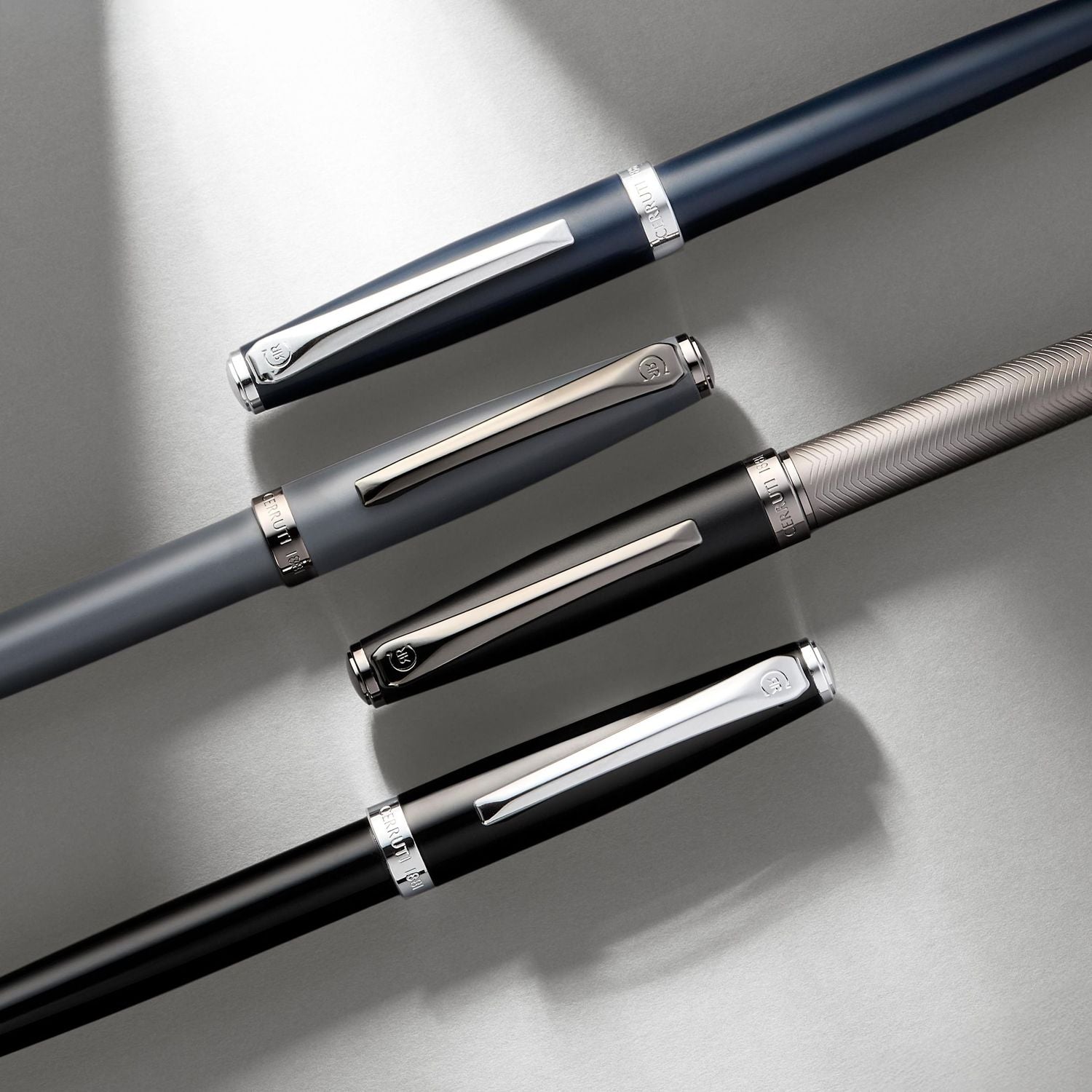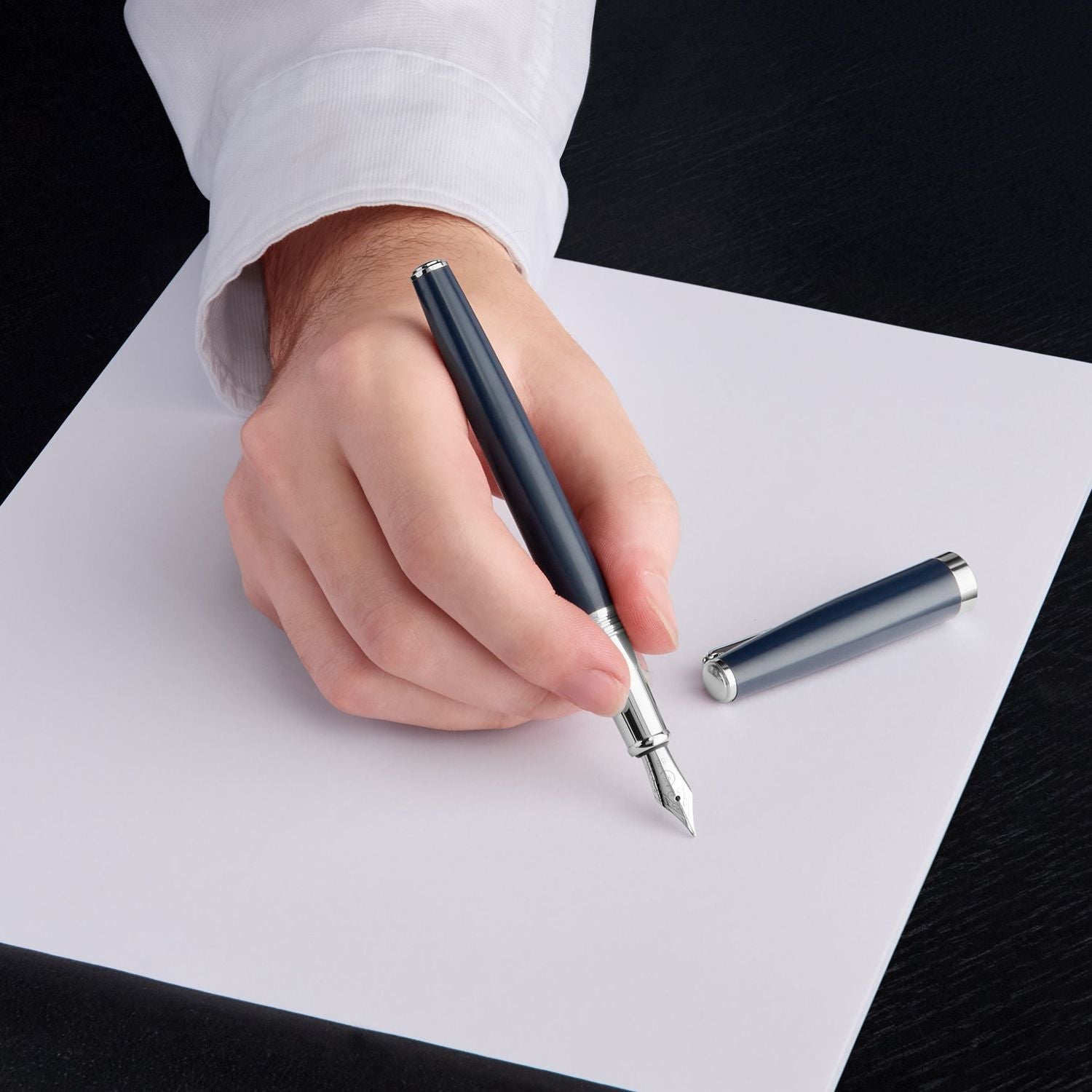 Dieser Füllfederhalter aus der Serie Cerruti 1881 Islington ist der Inbegriff von Raffinesse. Er hat ein mattes marineblaues Finish und verchromte Zierteile. Er verfügt über ein Schraubkappensystem für verbesserte Funktionalität und ist mit dem CRR-Logo auf dem Clip verziert, der universelle Anziehungskraft mit luxuriöser Handwerkskunst verbindet.