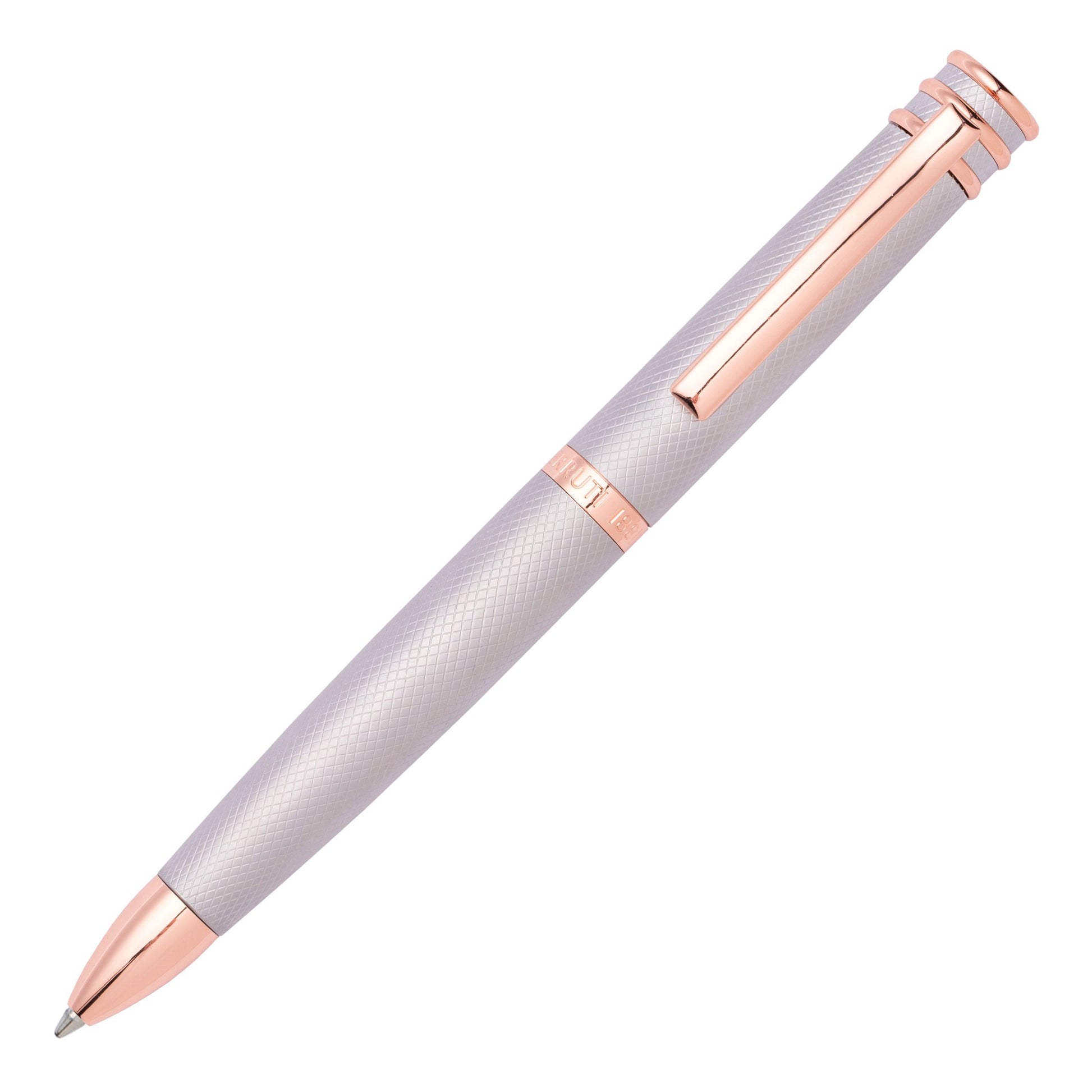 Der Kugelschreiber "Austin" basiert auf einer der ikonischsten Silhouetten von Cerruti: dem Ringkopf. In dieser neuen Version spielen wir mit einer diamantgeschliffenen, gravierten Oberfläche, die mit wunderschön plattierten Metallzierteilen verziert ist. Diese verchromte Version ist mit roségoldenen Ziernähten verziert: eine Mischung, die gleichzeitig vintage und sehr aktuell wirkt.