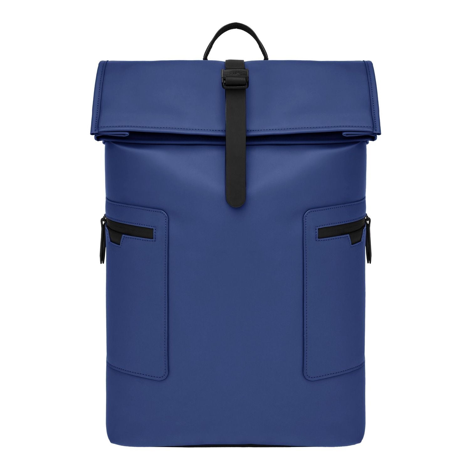 Designed with form as much as function in mind, this casual-inspired rolled-top backpack is offered in a vibrant bright blue for a trend-forward expression, elevated by elegant black matte details. A subtle utilitarian aesthetic is expressed through its rolled-top closing construction, perfectly finished with an integrated magnetic closure engraved with the RR signature. The silhouette is light and roamy, ideal for daily movement. Two flat zipped pockets to the front provide practical organization, while the interior features a dedicated laptop compartment for everyday essentials. A padded back panel and padded shoulder straps ensure lasting comfort in use. Inside, a spacious roamy interior reveals a refined monogram lining, completed with a zipped inner pocket for secure storage. It is the perfect accessory for someone with a minimalist yet casual and modern aesthetic.