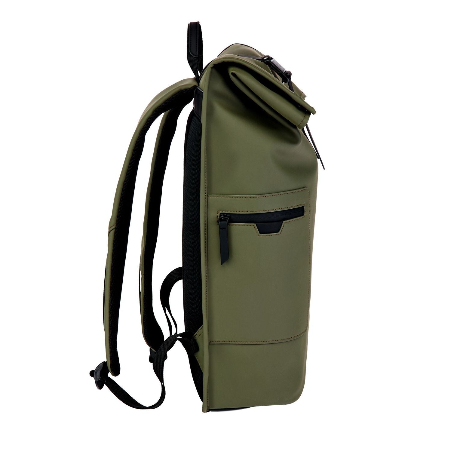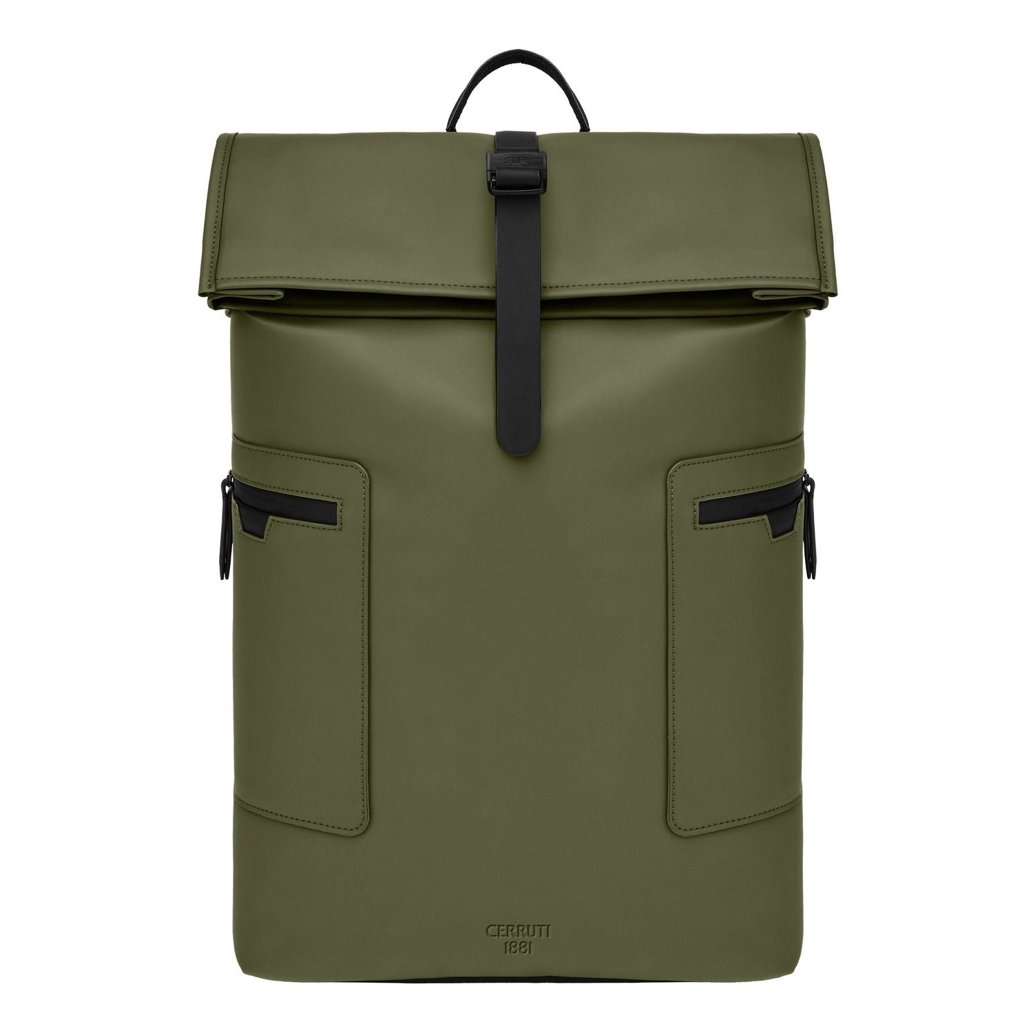Designed with form as much as function in mind, this casual-inspired rolled-top backpack is offered in a refined khaki green, contrasted with elegant black matte details. A subtle utilitarian aesthetic is expressed through its rolled-top closing construction, perfectly finished with an integrated magnetic closure engraved with the RR signature. The silhouette is light and roamy, ideal for daily movement. Two flat zipped pockets to the front provide practical organization, while the interior features a dedicated laptop compartment for everyday essentials. A padded back panel and padded shoulder straps ensure lasting comfort in use. Inside, a spacious roamy interior reveals a refined monogram lining, completed with a zipped inner pocket for secure storage. It is the perfect accessory for someone with a minimalist yet casual and modern aesthetic.