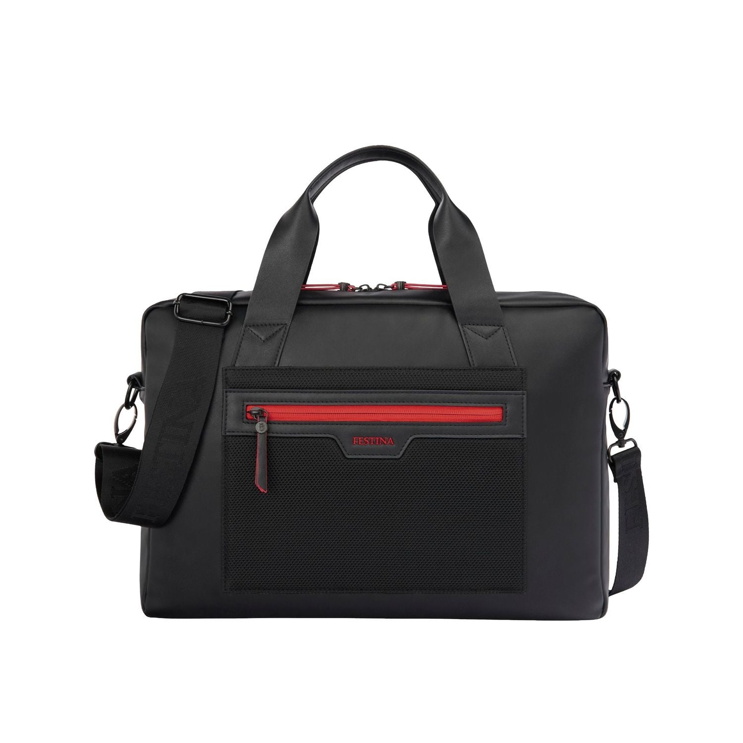 Die Dokumententasche "Black Edition" von Festina vereint schlankes Design, moderne Funktionalität und leichtes, praktisches Gewicht. Gefertigt aus mattschwarzem veganem Leder mit innovativen Mesh-Akzenten, verkörpert sie die aktiv inspirierte und zeitgenössische Ästhetik der Linie. Die Tasche verfügt über ein Reißverschlussfach auf der Vorderseite, ein spezielles Laptop-Fach im Inneren und ein zusätzliches Reißverschlussfach, so dass sie ideal für die Organisation und den Schutz Ihrer technischen Geräte ist. Leuchtend rote Akzente werden durch den Frontreißverschluss, die Kante der Reißverschlüsse und das Logo gesetzt und bilden einen auffälligen Kontrast zur minimalistischen schwarzen Basis. Diese leuchtenden Details verleihen der Tasche Dynamik und bewahren gleichzeitig den klaren und raffinierten Stil, für den Festina bekannt ist. Diese sorgfältig entworfene Dokumententasche ist eine perfekte Mischung aus Zweckmäßigkeit, Eleganz und Modernität, ideal für jeden aktiven Lebensstil.