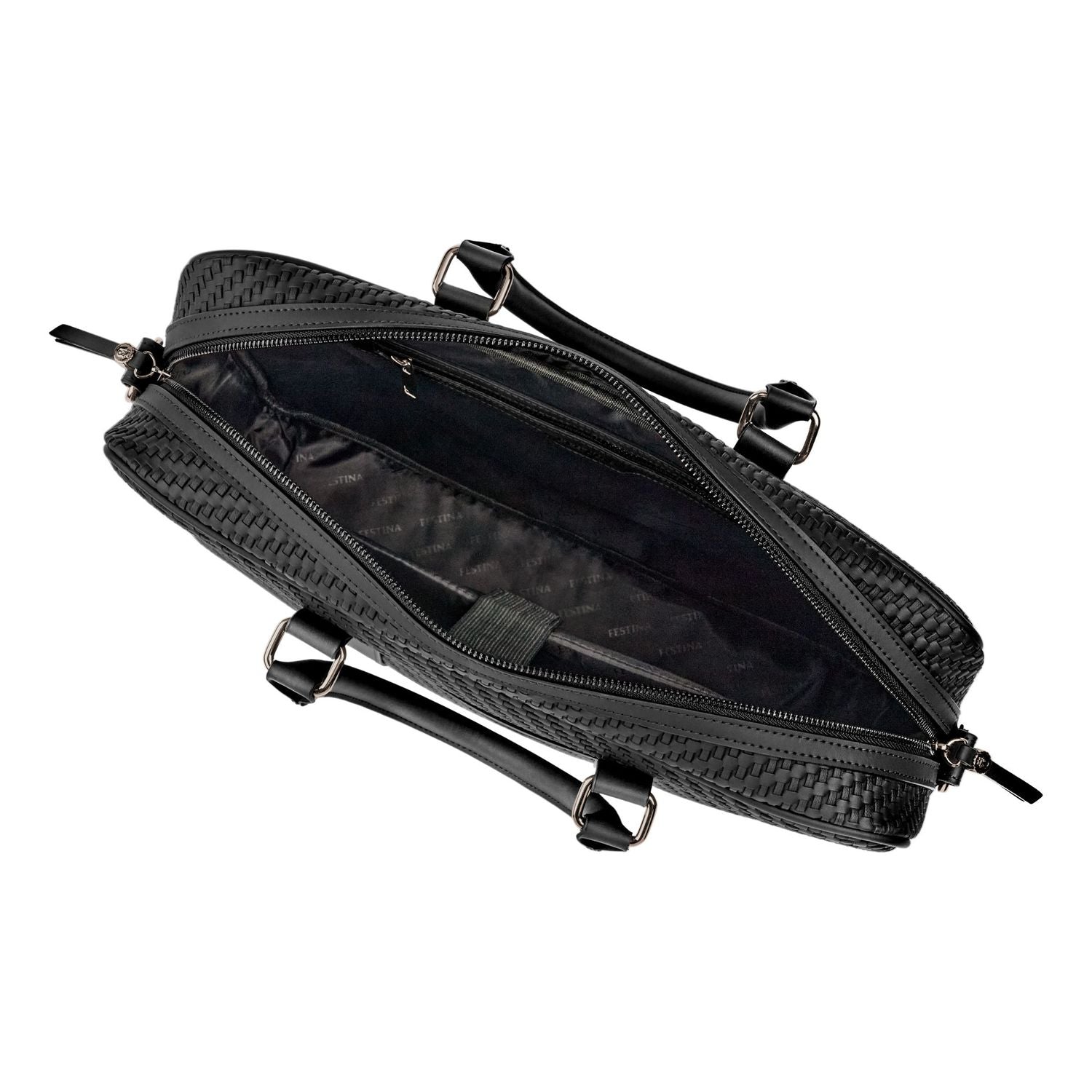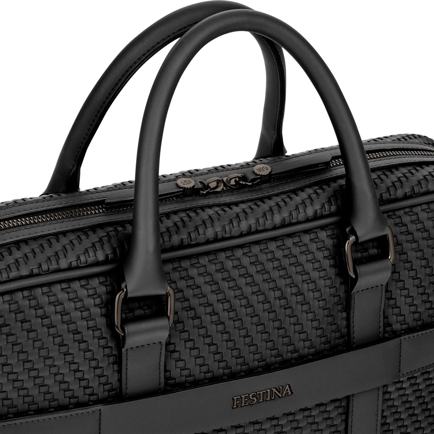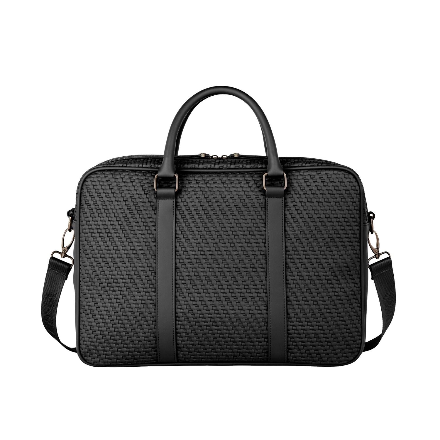 The Interlace document bag in black brings the line?s woven-inspired texture into a classical, timeless silhouette. Crafted to resemble meticulous braiding and finished in a smooth matte, it offers a luxurious, contemporary feel enriched by signed details, including blazon-engraved zipper pullers. Inside, the organisation is ideal, featuring a dedicated laptop compartment, an inside zipped pocket, and a monogramed lining that reinforces the refined finishing. A retractable, adjustable strap signed with the logo adds comfort and practicality for daily use. Completed with sleek gun accents, the design remains resolutely chic, centered on rich texture and modern elegance.