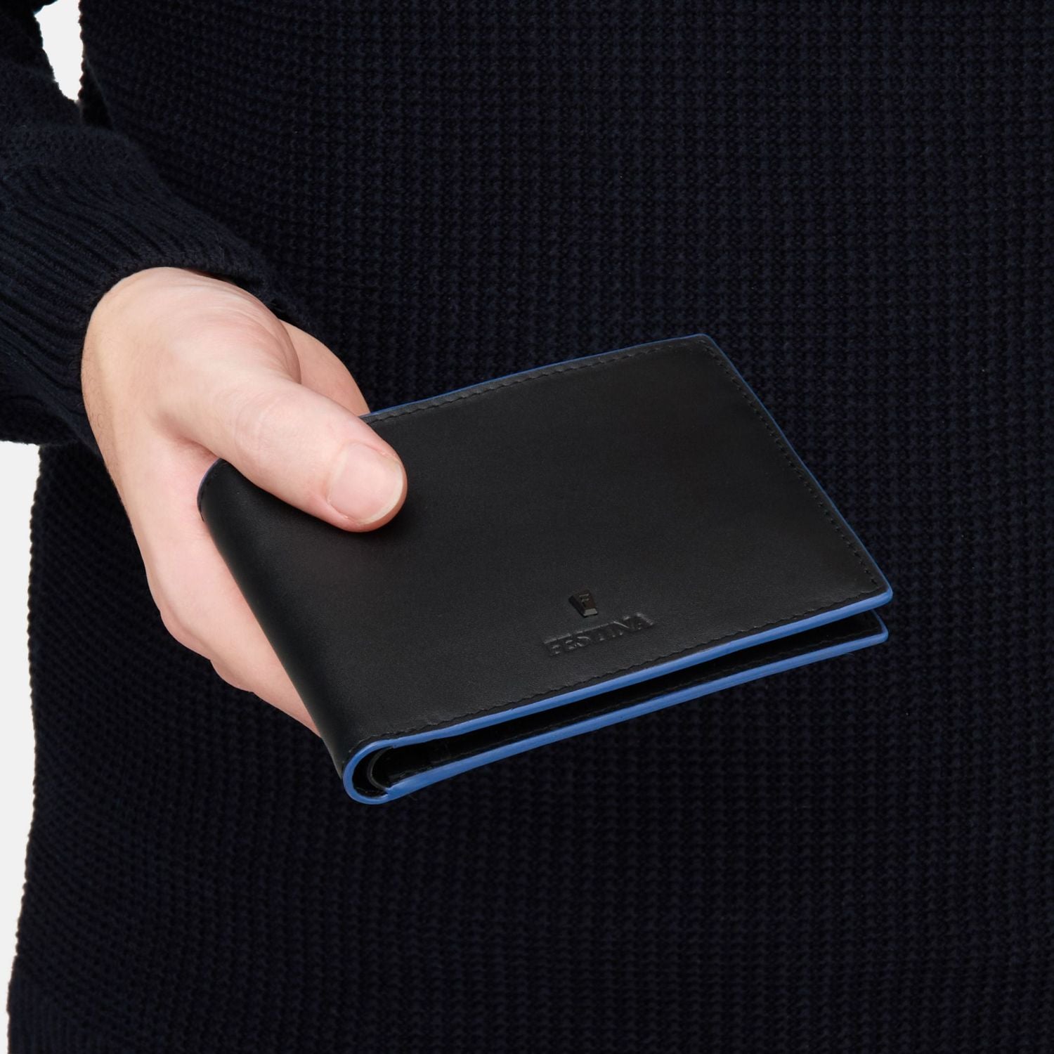 Das Black Edition Kartenetui von Festina ist ein Beweis für zeitlose Eleganz mit einem kühnen Twist. Sie ist aus sorgfältig ausgewähltem, mattschwarzem Leder gefertigt und mit dem ikonischen F-Schild in mattschwarzer Tonalität signiert. Das Design wird durch leuchtend blaue Randdetails aufgewertet, die einen dynamischen Kontrast zur schlichten Ästhetik bilden. Diese klassische Brieftasche verfügt über acht Kartenfächer, vier Seitenfächer und ein großes, zweigeteiltes Fach für Geldscheine und bietet außergewöhnliche Funktionalität in einem raffinierten Stil. Ein echter Klassiker, neu interpretiert für die moderne Zeit.