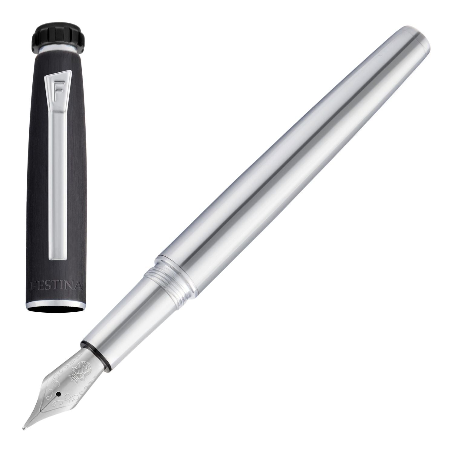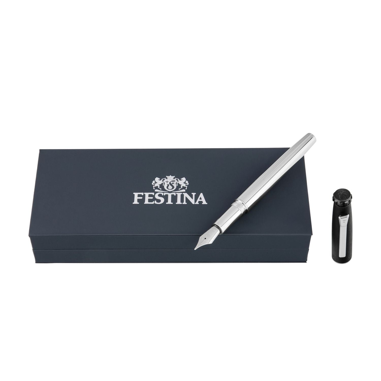 Der Chronobike-Füllhalter mit gebürsteter schwarzer Kappe und verchromtem Korpus verkörpert die Essenz der Kollektion aus Modernität und Aerodynamik. Seine schlanke, eiförmige Form erinnert an Bewegung und Eleganz, während die Chromakzente sein raffiniertes Design unterstreichen. Kennzeichnende Details wie der vom Stoppknopf der Chronobike-Uhr inspirierte Deckel und der kühne Festina Blason unterstreichen die unverwechselbare Handwerkskunst. Abgerundet mit dem charakteristischen Clip der Serie, verbindet dieser Kugelschreiber nahtlos Stil und Funktionalität und unterstreicht die Hingabe von Festina für Präzision und Liebe zum Detail.