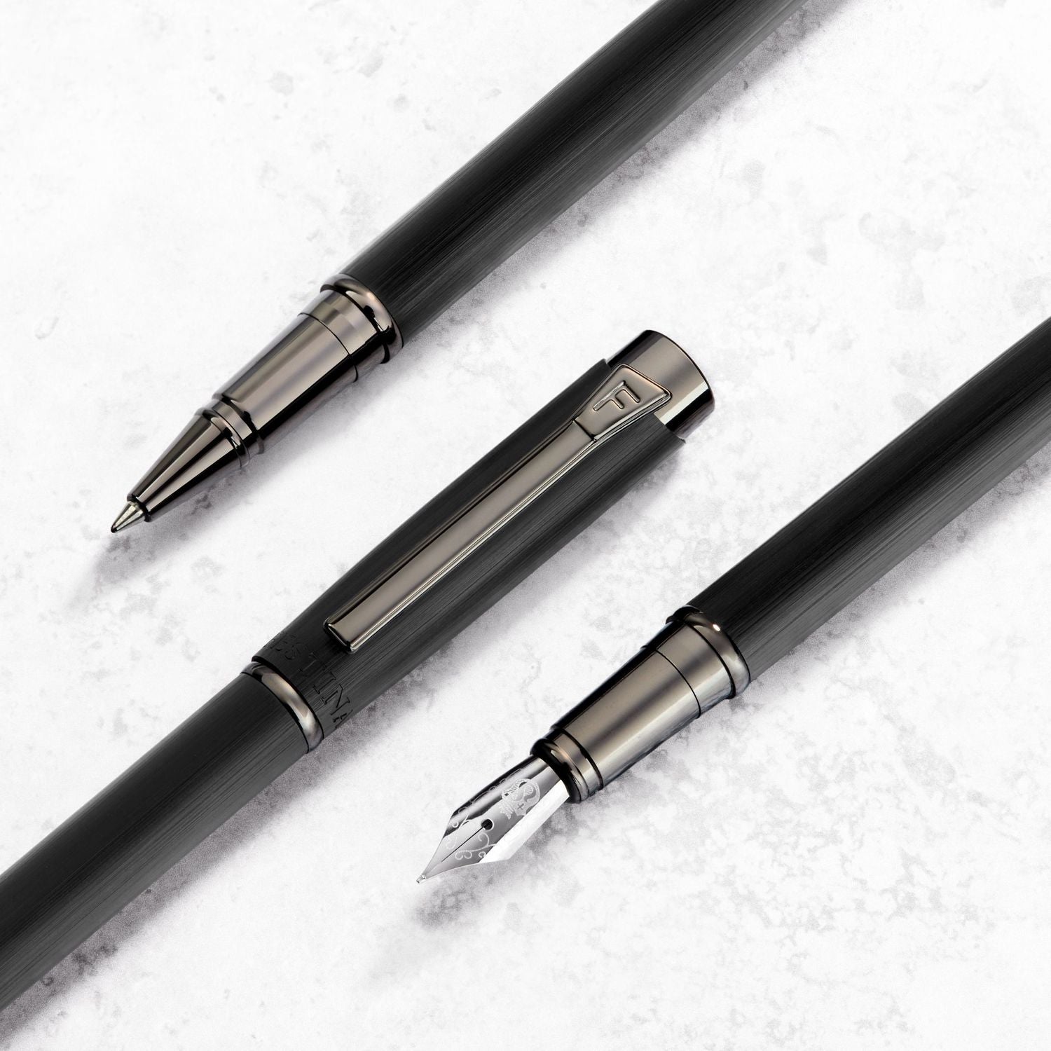 Der neue Füllfederhalter "Originals" aus schwarzem, gebürstetem Aluminium mit glänzenden Zierelementen ist ein elegantes und vielseitiges Schreibgerät. Das kräftige schwarze Finish verleiht dem minimalistischen Rahmen einen modernen Touch, während die glänzenden Zierteile einen auffälligen Kontrast bilden. Das sorgfältig gefertigte Schreibgerät verfügt über den ikonischen F-gravierten Clip, das unverwechselbare Wappen an der Oberseite und eine Oberfläche aus gebürstetem Aluminium, die für ein leichtes, müheloses Aussehen sorgt. Dieser auf Präzision und Funktionalität ausgelegte Kugelschreiber verbindet Stil und Funktionalität nahtlos und ist damit die ideale Wahl für jede Schreibaufgabe.