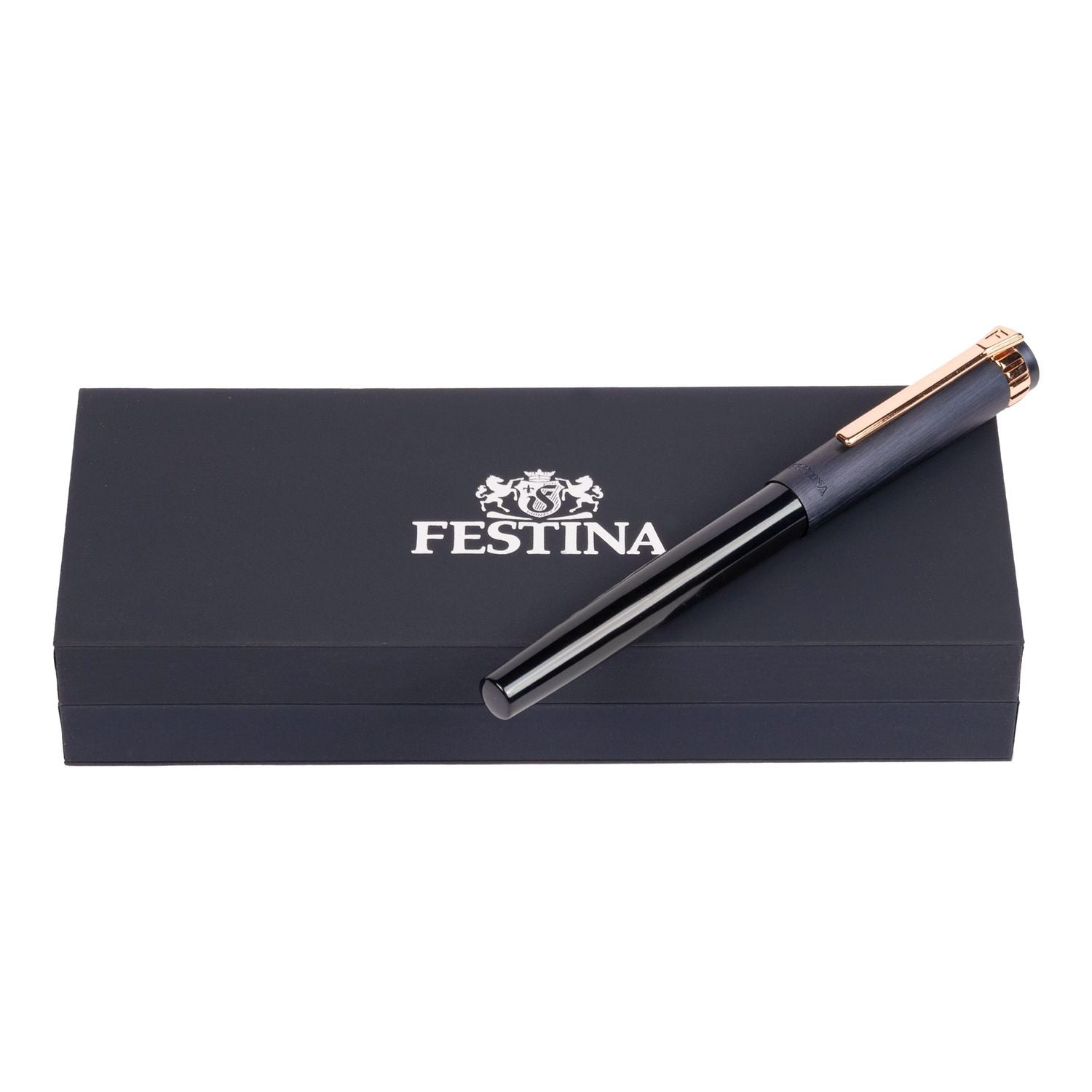 Der Prestige-Füllhalter ist mit analogen Texturen und Ornamenten verziert, die er von den Festina-Zeitmessern geerbt hat, und verkörpert mit seinen zarten Konturen und Tönen eine raffinierte Eleganz: eine Mischung aus einer gebürsteten nachtblauen Kappe und einem glänzenden marineblauen Chromkörper mit roségoldenen Verzierungen.