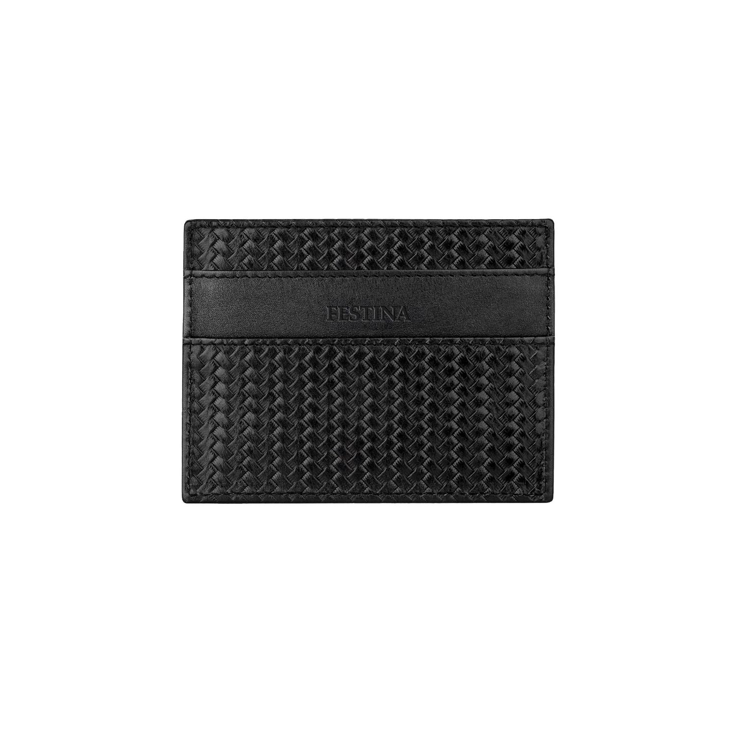 The Interlace card holder is crafted from selected leather and enhanced with an imprinted braided woven pattern that lends a luxe, effortlessly chic appeal. Its clean, minimal silhouette is refined by a single button engraved with the brand?s blazon, echoing the signature pattern also found on selected pens for an elegant pairing in polished gift sets. Compact yet designed for optimal organization, it offers two front slots, two back slots, and a main top compartment, with a smooth leather panel at the back featuring a luxurious yet understated embossed Festina logo.