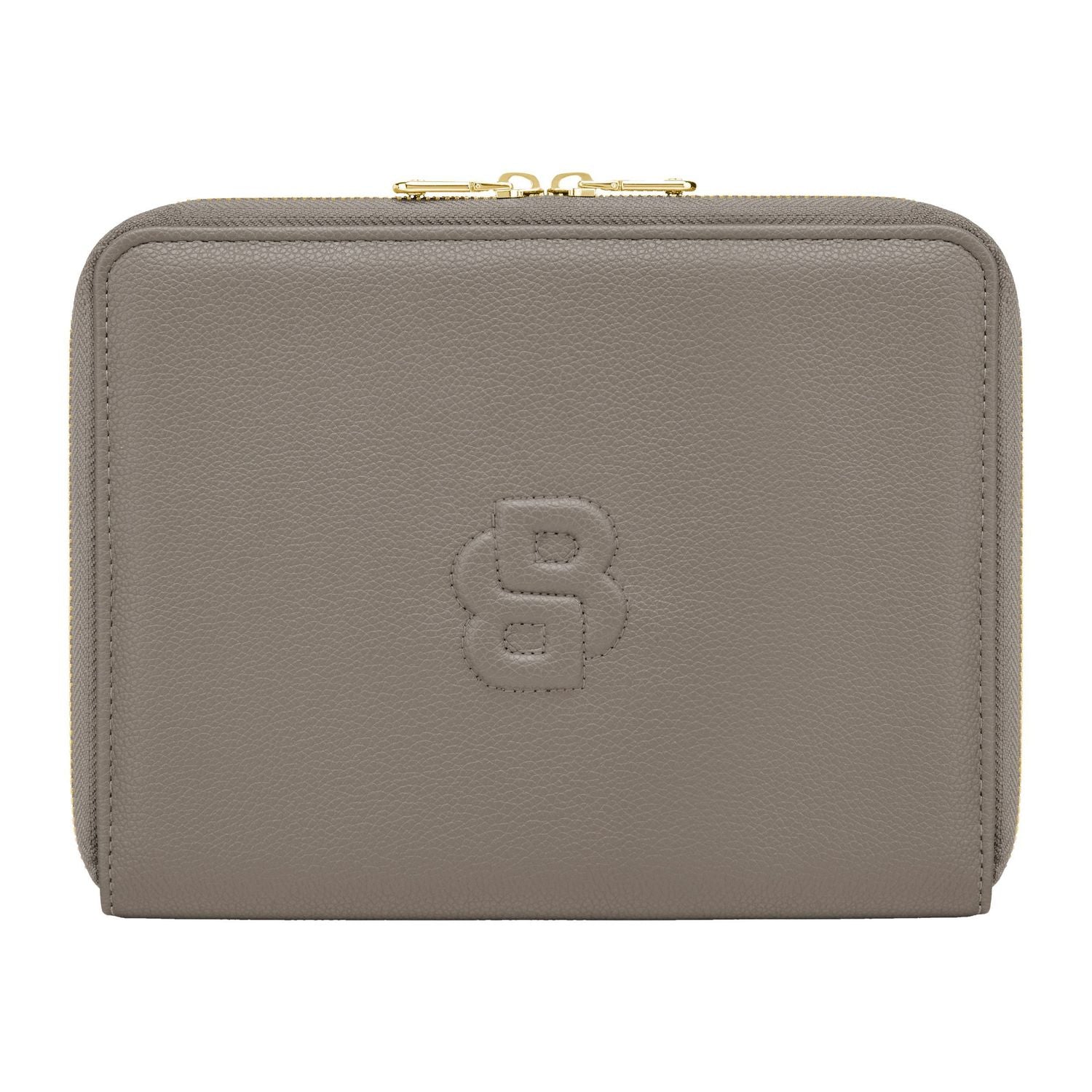 This signature lady folder in taupe highlights a big yet minimal three dimensional Double B logo as its defining feature. The raised logo adds a sense of quiet luxury while preserving a soft, balanced aesthetic. Made from beautifully grained matte PU, the material was carefully selected to elevate both look and feel. Soft gold accents run throughout the design, in harmony with the rest of the line, and are completed by newly developed Double B zipper pullers with a refined, jewelry-inspired character. The taupe tone brings softness and modern elegance, subtly warmed by gold details and the BOSS signature.