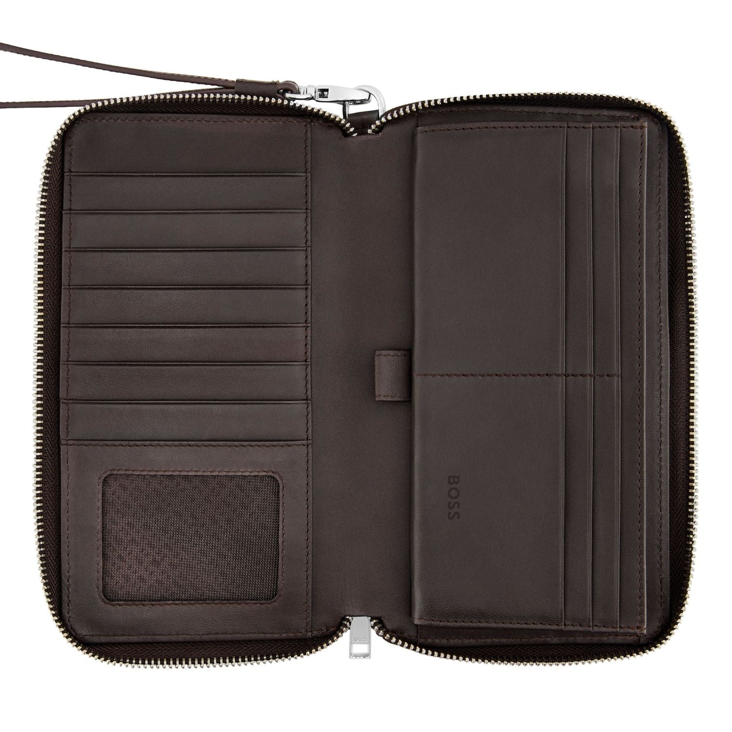 This travel wallet is crafted from carefully selected top-grain smooth brown leather, highlighted with a luxurious chrome BOSS signature plate and finished with a monogrammed inside lining. The zipped construction is completed with the new signed BOSS zipper puller, perfectly matching the trims. Inside, it offers a spacious and practical layout: the left side includes 8 card slots and a large compartment, while the right side functions as a full wallet with a double gusset, a large zipped coin compartment, 12 card slots, and an additional note compartment. Both functional and luxurious, it delivers an elegant solution for everyday and travel essentials.