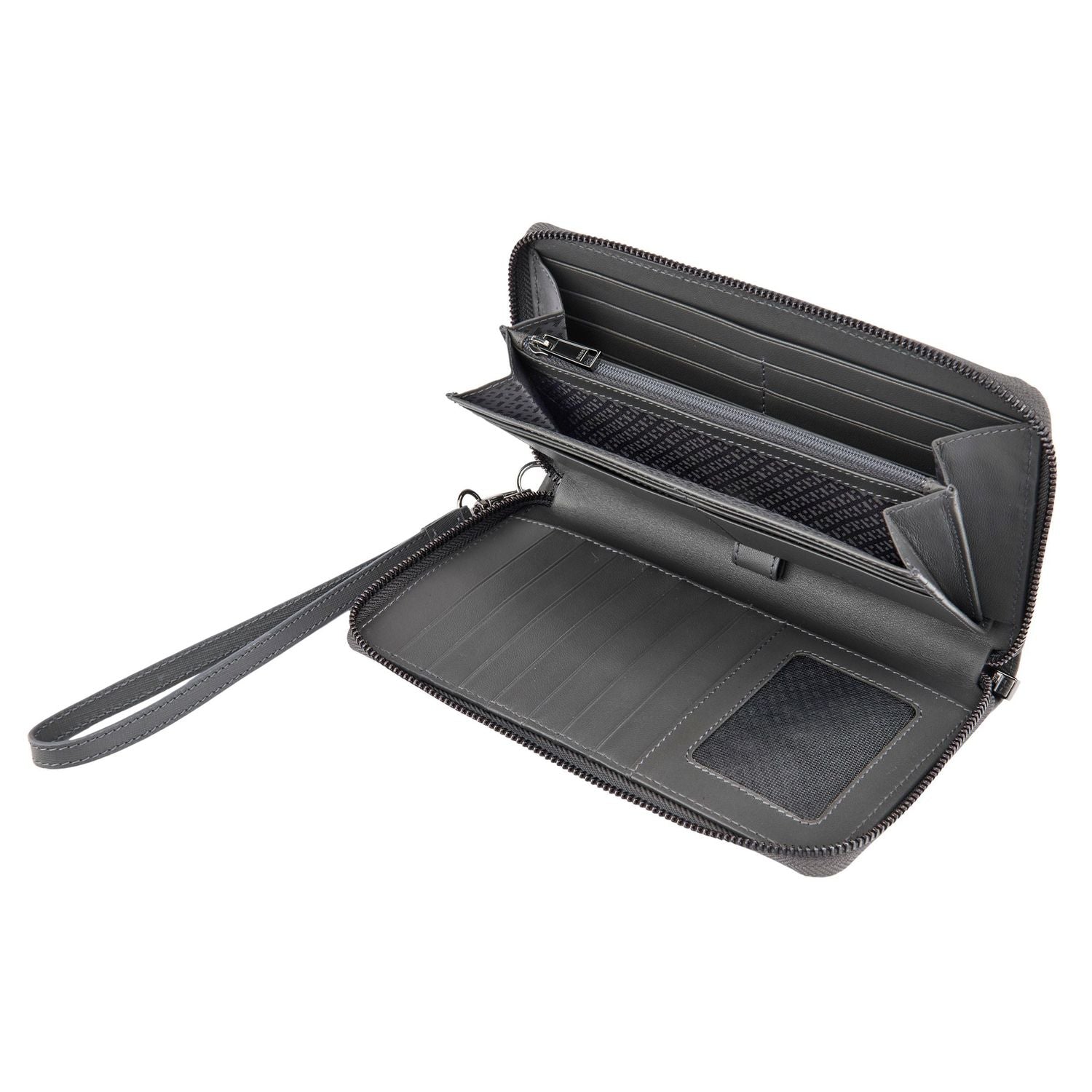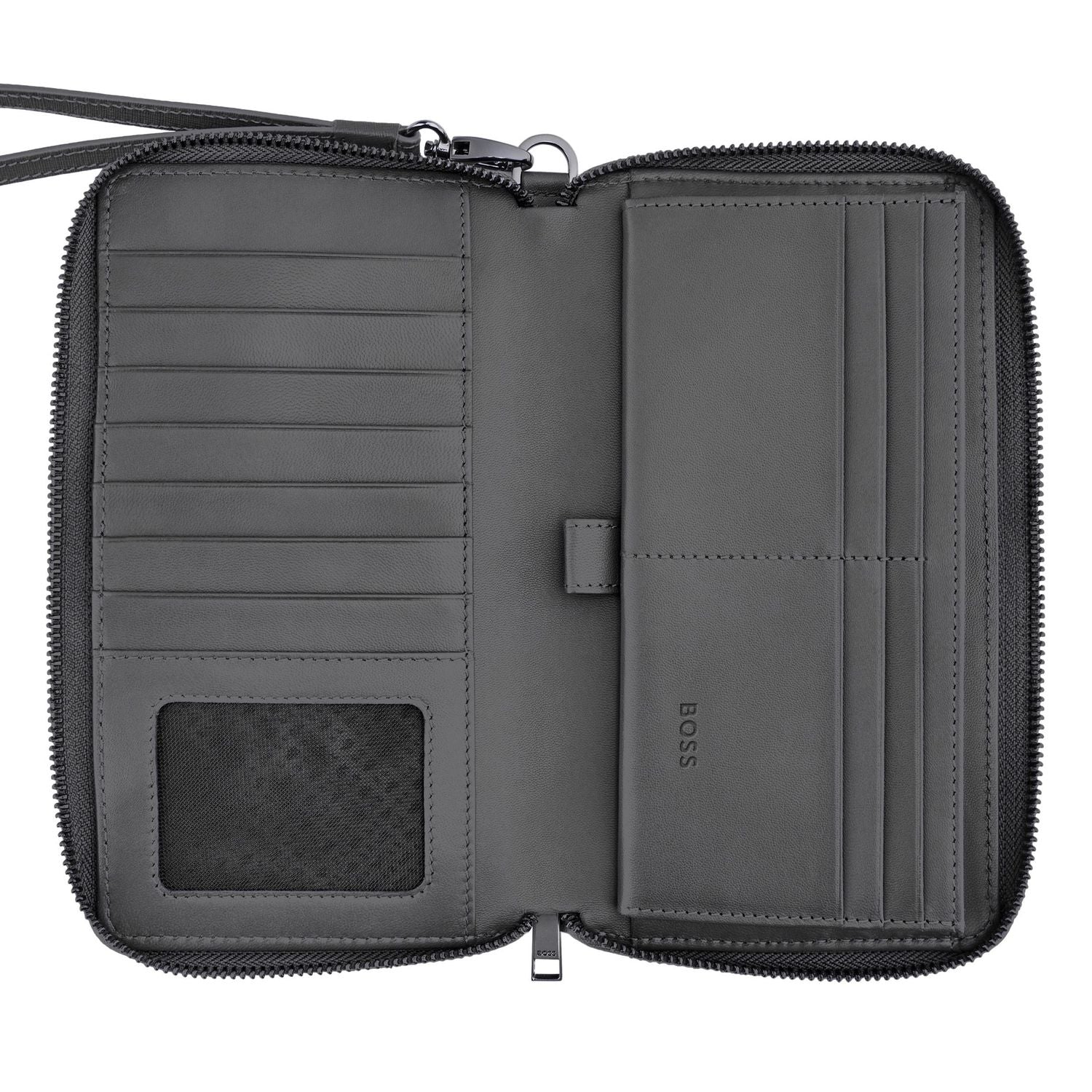 The Double B Saffiano line is crafted from carefully selected top-grain leathers, defined by a saffiano print in a matte execution that conveys a refined, luxury feel. Each piece is skillfully assembled and beautifully finished with the new Double B plate in deep gun plating, a contemporary signature touch. Available in black or grey, this zipped wallet features the new signed BOSS zipper puller in harmony with the trims. Inside, it opens to a spacious layout: the left side includes 8 card slots and a large compartment, while the right side is designed as a full wallet with a double gusset, a large zipped coin compartment, 12 card slots, and an additional note compartment. Both functional and luxurious, it brings sophistication to everyday essentials.