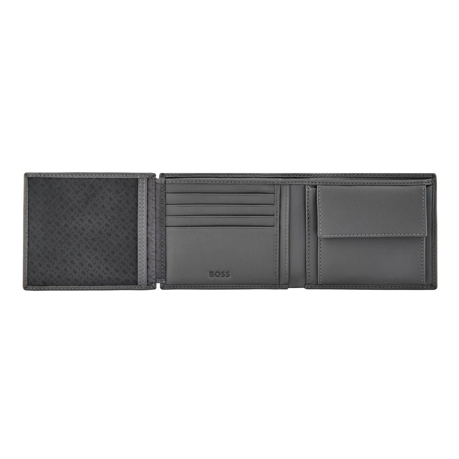 The Double B Saffiano line is crafted from carefully selected top-grain leathers, defined by a saffiano print in a matte execution that lends a refined, luxury feel. Each piece is skillfully assembled and beautifully finished with the new Double B plate in deep gun plating, bringing a contemporary signature touch. Available in black or grey. The wallet includes: 2 currency compartments 8 card slots 3 side compartments 1 coin slot In line with the BOSS brand DNA, it is simple, functional, elegant, and minimal.