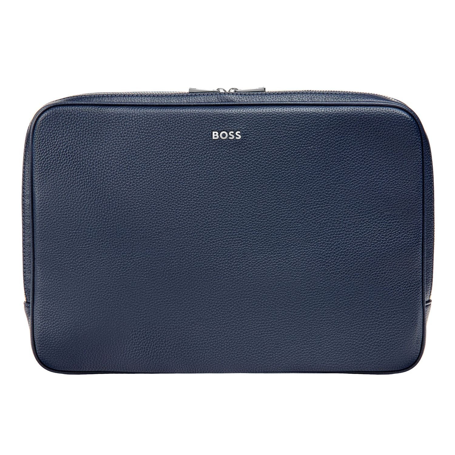 The Grained Classic computer sleeve is crafted in a soft leather-like grained texture, accented with a crisp chrome signature plate and matching chrome zippers. Inside, a tone-on-tone monogrammed lining highlights the refined finish. Designed with multiple compartments, it offers exhaustive organization for everything from pens and documents to cables, cards, or a phone. Available in black, navy, khaki, and taupe.