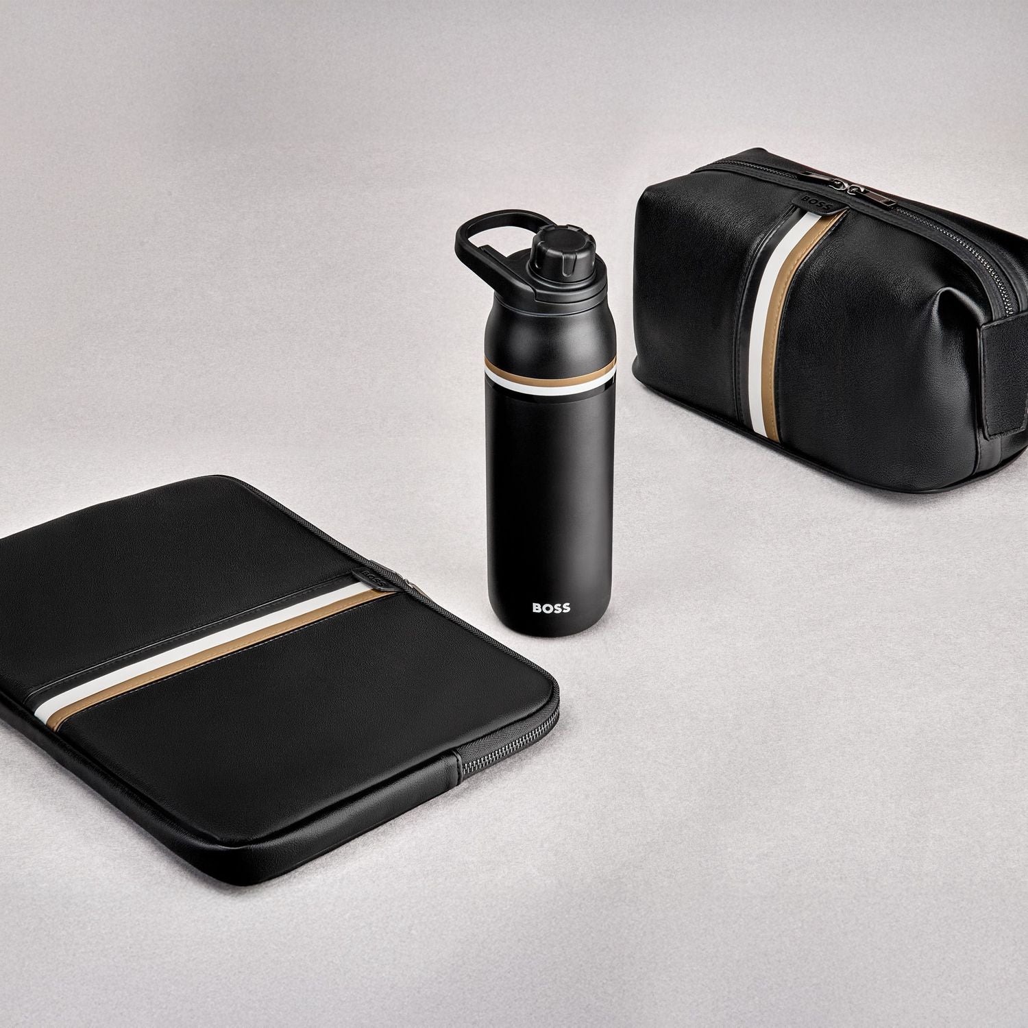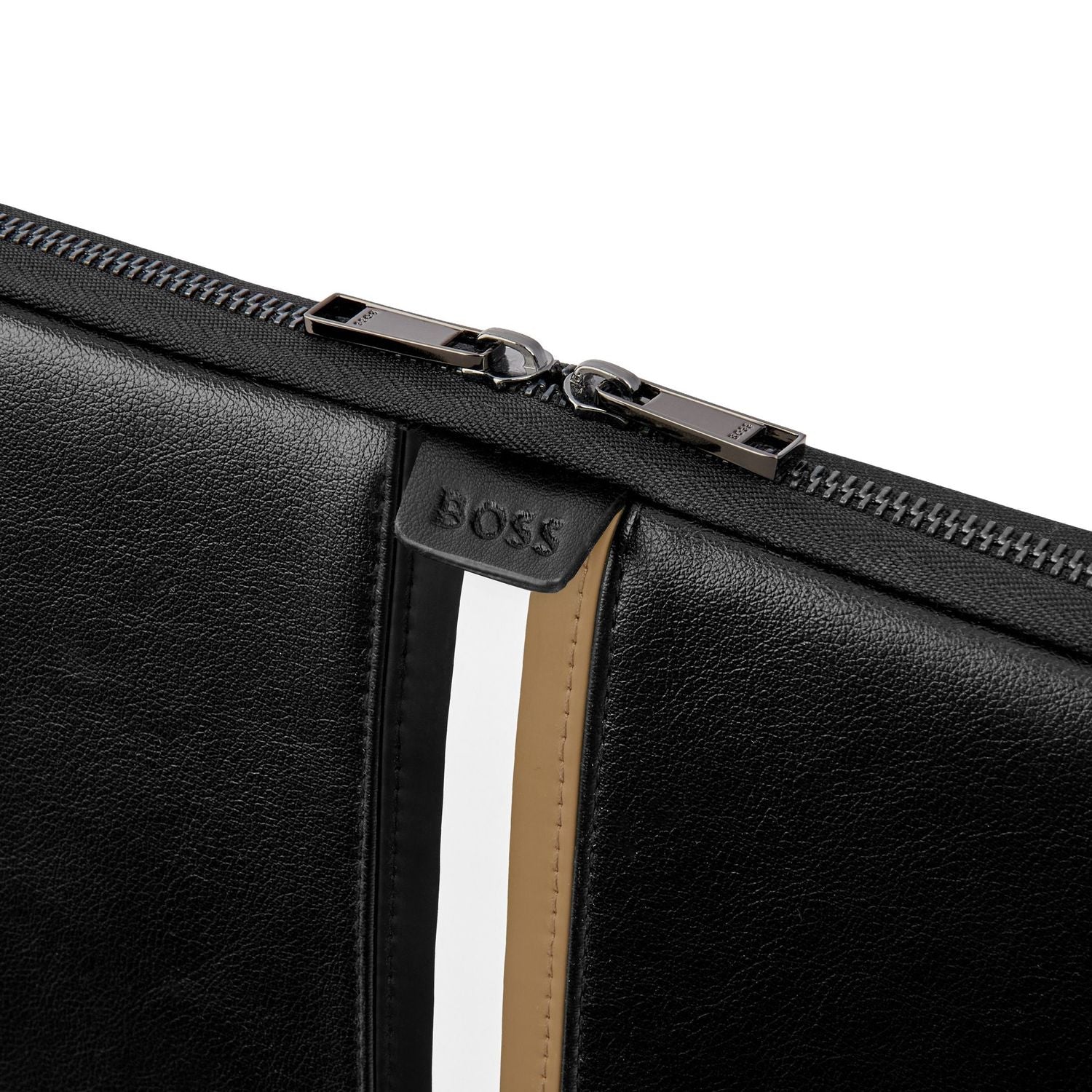 This computer pouch blends an active-inspired design with a luxurious finish. Made from smooth, soft black PU, it showcases a central printed stripe in the brand?s iconic three colors, highlighted by a logo-embossed tag. Gun-plated zippers engraved with the logo add a refined touch, while the interior features a tone-on-tone monogrammed lining. Both stylish and practical, it is the perfect everyday accessory for brand enthusiasts.