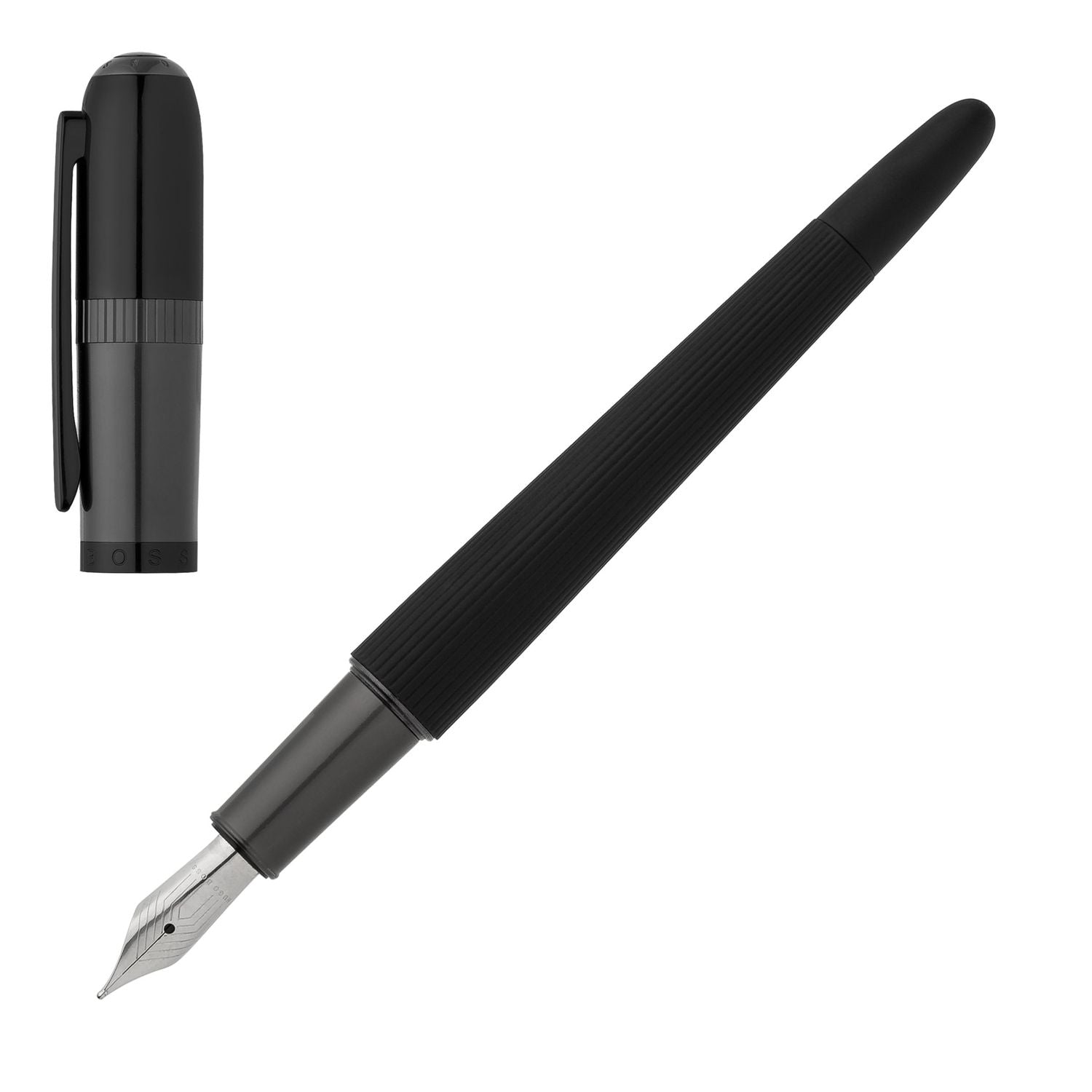 Die Contour Schreibgeräte sind mit ihrer leichten und ausgewogenen Linienführung kontrastreich. Das klassische Erscheinungsbild ihrer leicht gerundeten Silhouette wird durch die raffinierte Formgebung und die zeitgemäße Materialwahl noch verstärkt. Fein gravierte Linien spiegeln die Bekleidungswelt von HUGO BOSS wider. Sie finden sich als dekoratives Element auf dem Korpus und der Kappe. Der Artikel ist als Füllfederhalter, Tintenroller und Kugelschreiber erhältlich.