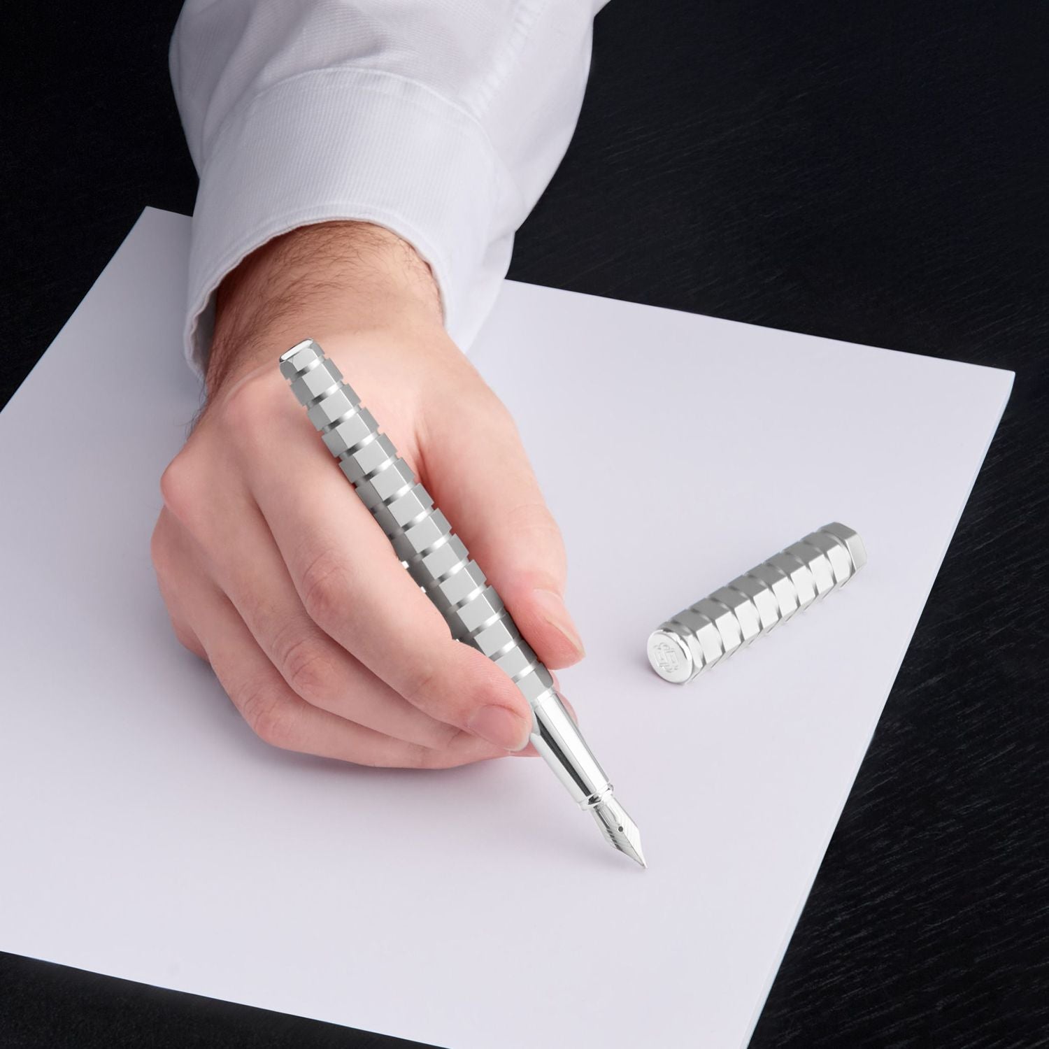 Dieses exklusive Schreibgerät wird in limitierter Auflage herausgegeben, wobei jedes Stück nummeriert ist. Dieses außergewöhnliche Stück wird in einer speziellen, limitierten Verpackung geliefert, wobei die Garantiekarte in einem luxuriösen Kartenetui aus Leder geschützt ist. Der Stift basiert auf einer markanten sechseckigen Form, deren Kantigkeit durch eine Reihe skulpturaler, rechteckiger Streifen noch betont wird. Dieses außergewöhnliche Schreibgerät, das die Grenze zwischen Skulptur und Architektur verwischt, ist vollständig mit minimalistischem, mattem Chrom überzogen, so dass das einzigartige Design in den Vordergrund tritt.