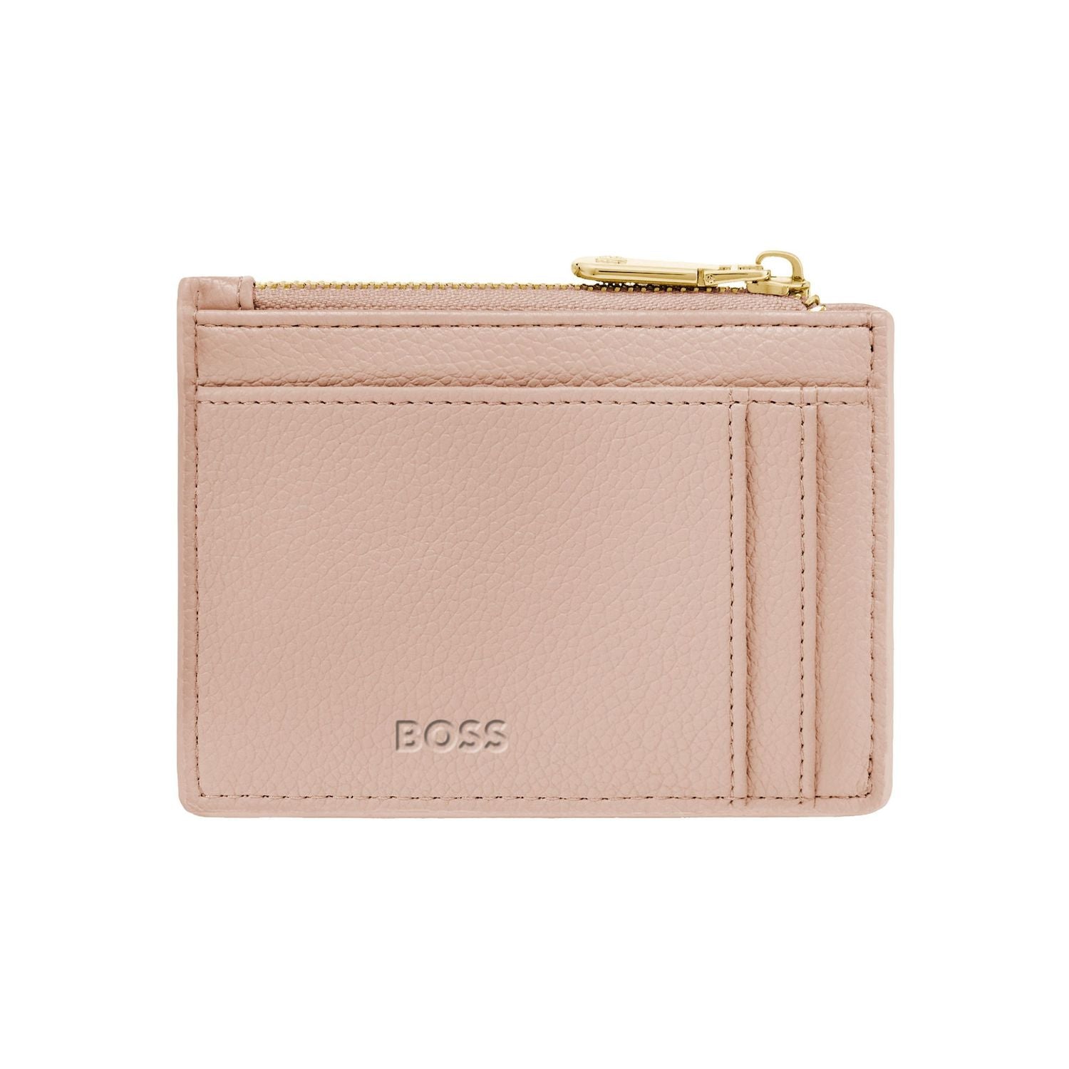 This refined accessory is designed as a hybrid between a card holder and a keyring, allowing it to be used seamlessly as both. Crafted in grained matte PU, it is highlighted by a Double B signature plate on the front and balanced by a BOSS logo embossed on the back. Newly developed light gold?plated zippers with a Double B detail bring a soft, delicate finish while maintaining a clean, minimal look. The construction features three card slots on the back and a roomy, gusseted main compartment secured with a zip, which includes an integrated BOSS keyring attached to a jewelry-like chain. Finished entirely with light gold trims, the piece is offered in a soft and vibrant color palette of black, burgundy, taupe, nude, and lilac.