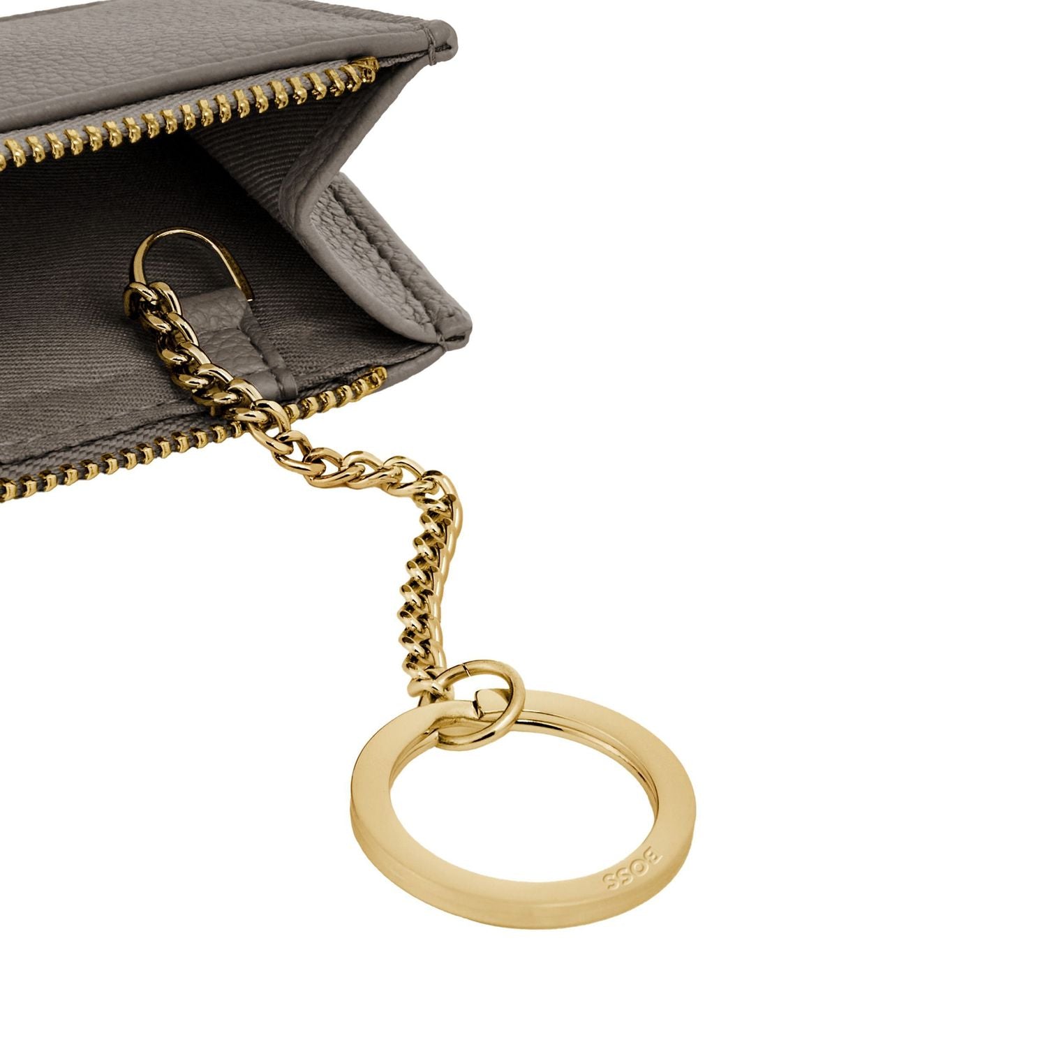 This refined accessory is designed as a hybrid between a card holder and a keyring, allowing it to be used seamlessly as both. Crafted in grained matte PU, it is highlighted by a Double B signature plate on the front and balanced by a BOSS logo embossed on the back. Newly developed light gold?plated zippers with a Double B detail bring a soft, delicate finish while maintaining a clean, minimal look. The construction features three card slots on the back and a roomy, gusseted main compartment secured with a zip, which includes an integrated BOSS keyring attached to a jewelry-like chain. Finished entirely with light gold trims, the piece is offered in a soft and vibrant color palette of black, burgundy, taupe, nude, and lilac.