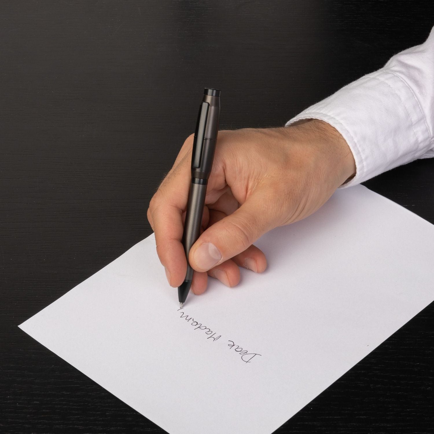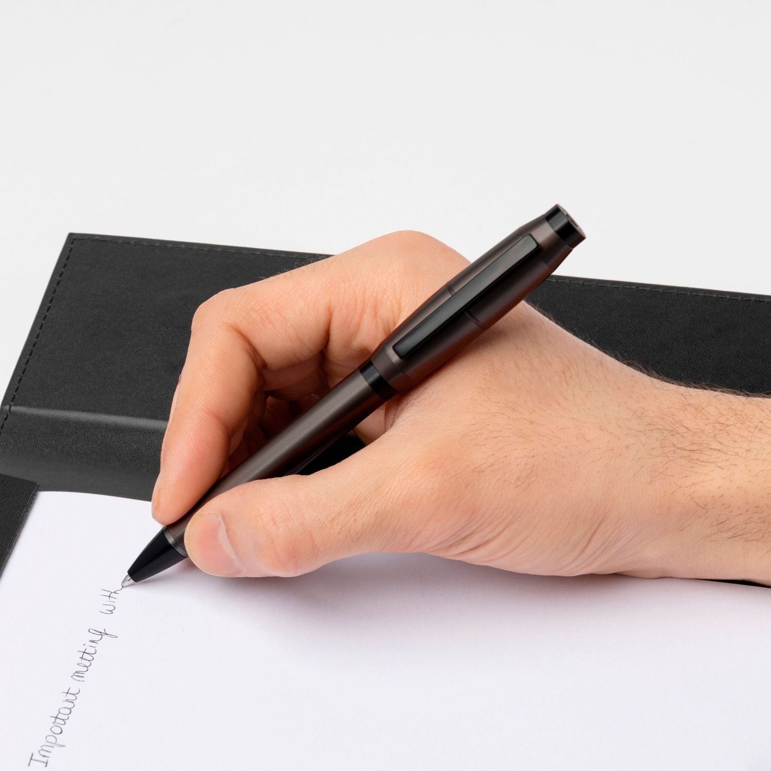 Eine futuristisch inspirierte Ästhetik, innovative Texturen und eine zeitgemäße Farbpalette sind die Grundlagen unserer neuen Cone Schreibgeräte. Der starke und ausgewogene Rahmen zeigt die fachmännische Handwerkskunst und die Liebe zum Detail, die für die Marke typisch sind, und wurde mit Blick auf dauerhaften Stil entworfen. Die mattschwarze Version mit ihren mattschwarzen Ziernähten unterstreicht das Engagement von HUGO BOSS für innovatives Design.