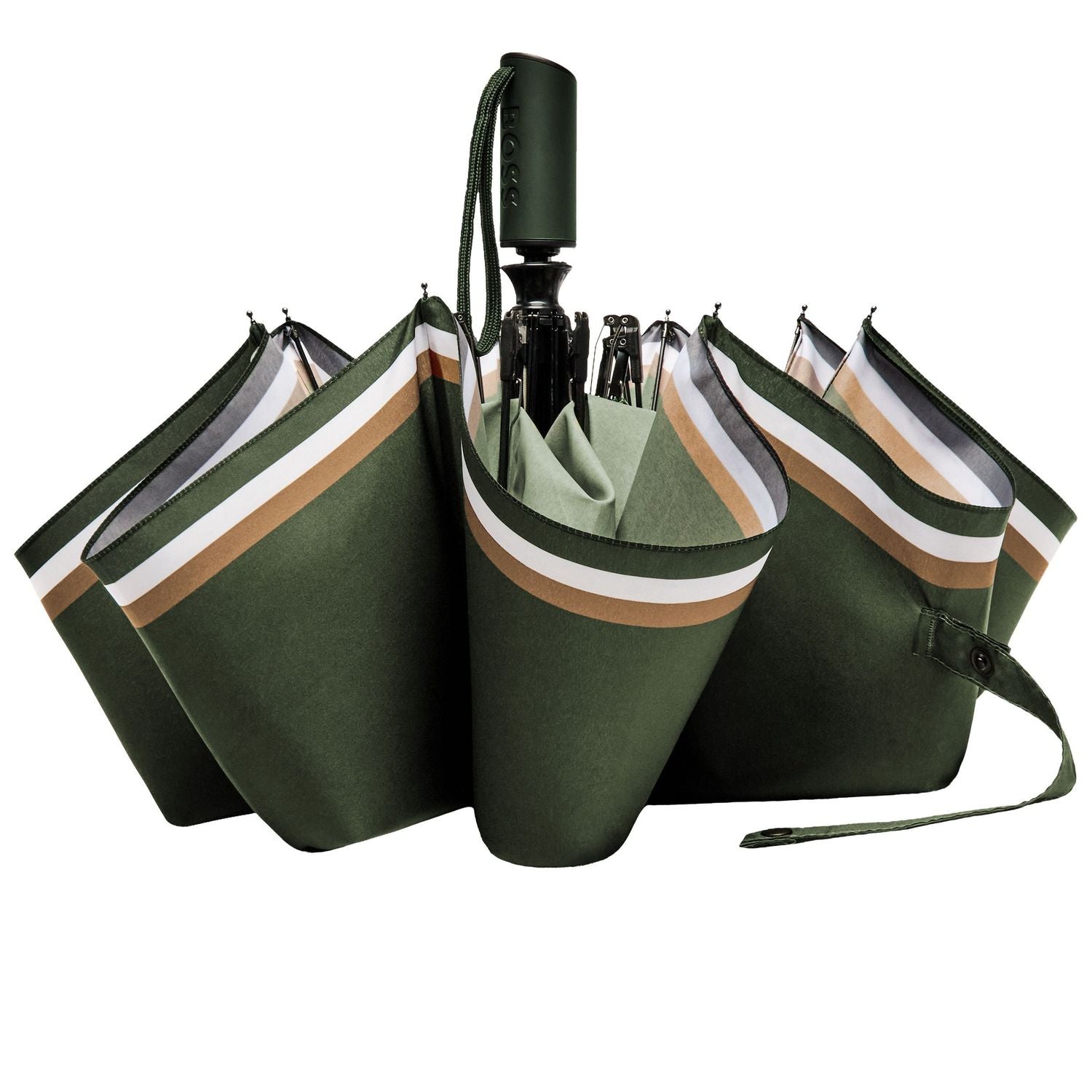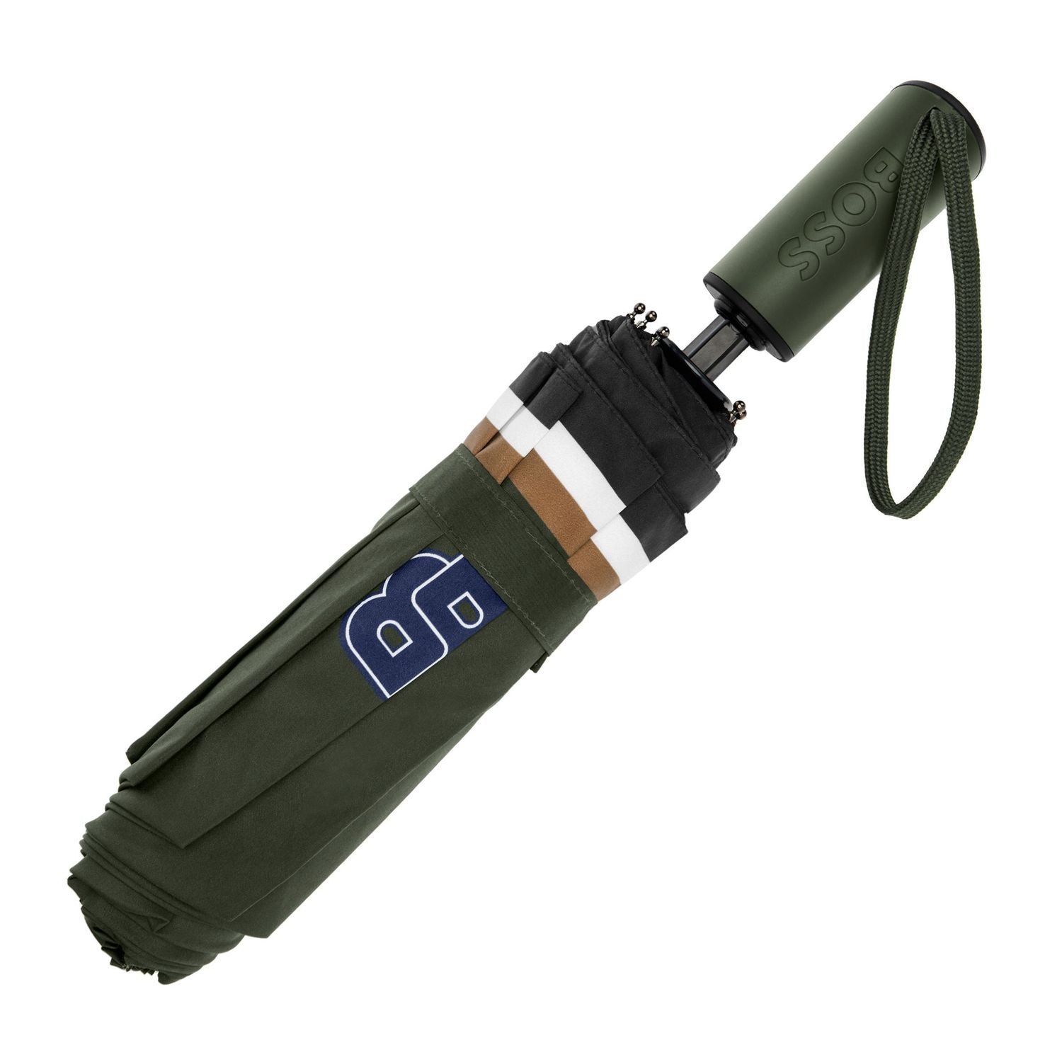 The Varsity umbrella channels a colorful, youthful energy with its bold, varsity-inspired graphical take on the Double B. The canopy is finished with the signature three-color stripe along the edge, adding a crisp nod to the brand?s codes. Offered in a compact pocket format, it comes in black, blue, forest green, and burgundy, each featuring a tonal handle luxuriously finished with the BOSS logo embossed.
