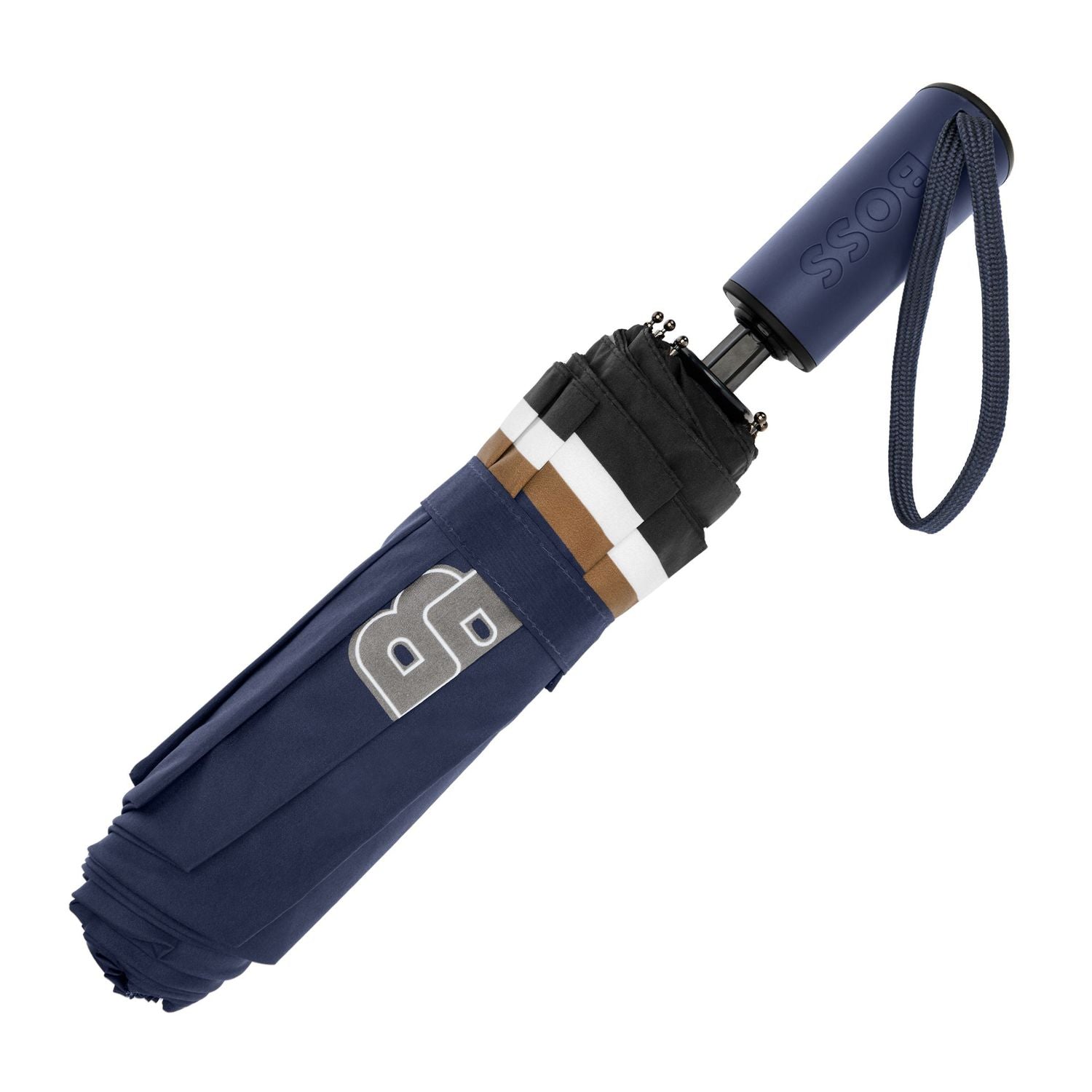 The Varsity umbrella channels a colorful, youthful energy with its bold, varsity-inspired graphical take on the Double B. The canopy is finished with the signature three-color stripe along the edge, adding a crisp nod to the brand?s codes. Offered in a compact pocket format, it comes in black, blue, forest green, and burgundy, each featuring a tonal handle luxuriously finished with the BOSS logo embossed.