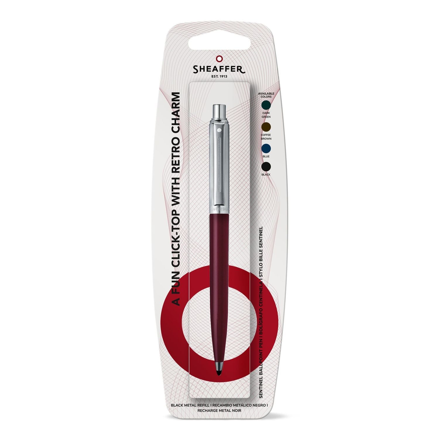 LUSTIGER CLICK-TOP MIT RETRO-FLAIR Die Sheaffer Sentinel Kollektion bietet coole und farbenfrohe Kugelschreiber für das tägliche Schreiben mit einem vertrauten, retro-inspirierten Click-Top-Design. Schlankes Profil mit klassischem Styling Retro-inspiriertes Click-Top-Design Zuverlässiges Schreibgerät für jeden Tag 100% plastikfreie, recycelbare Verpackung. Präsentiert in einer Hangsell-Packung zur Selbstbedienung.